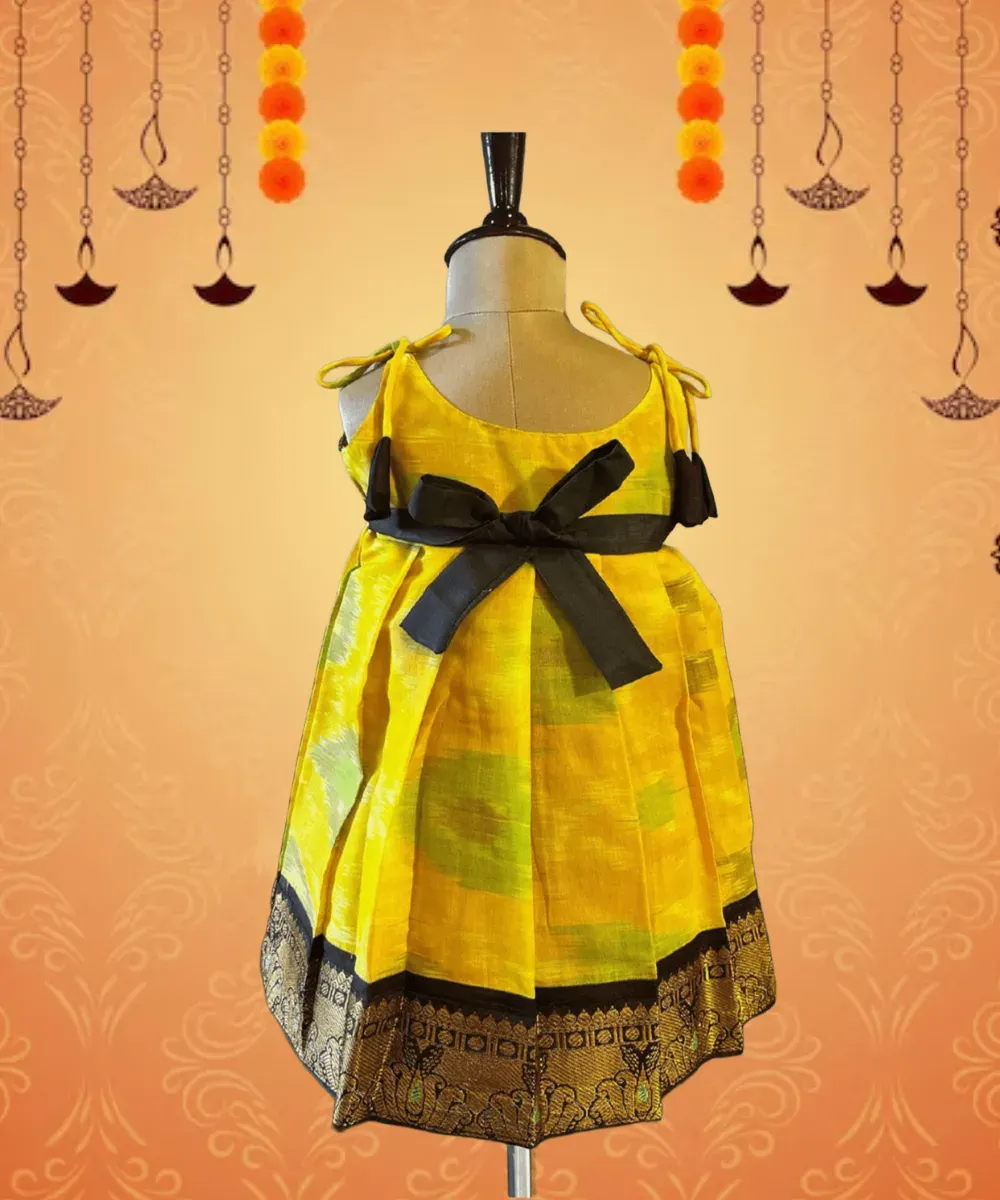* Design: Intricate brocade motifs on the yoke, complemented by a pleated skirt with a broad cute elephant zari border
